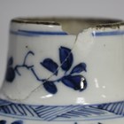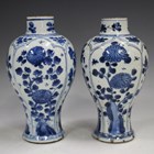 A near pair of Chinese blue and white porcelain vases, Kangxi period, each baluster body painted with four vertical arched panels, filled with flowers, heights 15.9cm and 16.1cm (one with chip and neck repair, both with typical rim and footrim chips).