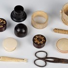 A group of mainly 19th century objects of virtu, including two Tunbridge ware circular boxes, other treen boxes and a carved bone pin cushion in the form of a basket, width 6cm.