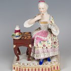 A pair of Vienna porcelain figures, 19th century, each modelled as a seated lady in the style of Meissen's Five Senses, depicting taste and sight, impressed marks to bases, height of tallest 14cm (minor faults).