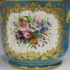 A pair of Sèvres style bleu céleste ground cachepots, 19th century, each painted with foliate and figural panels, framed by gilt, jewelled and enamelled fruiting vines, flanked by two scroll handles, blue painted pseudo Sèvres mark to bases, height 11.8cm.