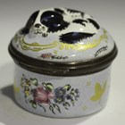 A Moorcroft limited edition Ice Floe enamel vase, circa 2001, designed by J. Bishop, decorated with polar bears, printed and painted marks including '162/200' to base, height 9.2cm, with certificate and box, together with a Halcyon Days enamel pill box, the hinged lid moulded with a dog.