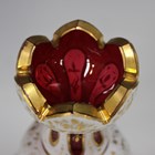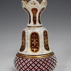 A Bohemian white flash overlay cranberry glass vase, late 19th century, the pear shaped body cut with panels with gilt foliate scroll decoration above a diamond cut border, height 14.3cm.