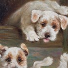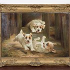 Lilian Cheviot - Three Terrier Puppies playing in a Barn, late 19th/early 20th century oil on canvas, signed recto, label verso, 38.5cm x 59cm, within a gilt composition frame.
