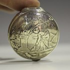 An Edwardian silver vesta case, monogram engraved, Birmingham 1901 by A. & J. Zimmerman Ltd, a Continental silver circular box with hinged lid, decorated in relief with a maiden feeding birds, import mark London 1892 by Samuel Boyce, diameter 4cm, two silver decanter labels, one inscribed 'Whiskey', Birmingham 1962, the other inscribed 'Sherry', Birmingham 1969, and a silver napkin ring, Birmingham 1922, total weight 112g.