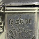 A near pair of early Victorian silver octagonal mustards, each with slightly domed hinged lid, with all-over engraved floral, foliate and 'C' scroll decoration, flanked by an angular handle, on a stepped octagonal base, London 1840 by Joseph Angell I and Joseph Angell II, heights 7.5cm and 8cm, together with two silver Fiddle pattern mustard spoons, London 1824 by John, Henry & Charles Lias and Sheffield 1881 by Cooper Brothers, total weight 298.7g.