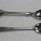 An early Victorian silver circular mustard with domed hinged lid and pierced thumbpiece above pierced foliate scroll sides and base, on a circular stepped foot, London 1840 by Charles Fox II, height 8cm, and another similar silver mustard with gadrooned rims, Sheffield 1898 by Joseph Rodgers & Sons, height 7.5cm, together with a silver Fiddle pattern mustard spoon, London 1834 by William Johnson, and a silver Old English pattern mustard spoon, London 1807 by EI, total weight 222g.