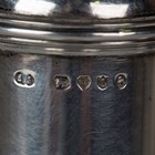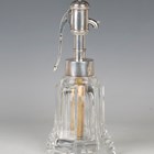 A late Victorian silver mounted cut glass novelty perfume bottle atomizer, modelled in the form of a water pump with tall cylindrical neck and pump handle, the clear glass body with four stepped feet, London 1886 by Edward H. Stockwell, engraved retailer's name 'Thornhill - 144 New Bond St' and inscription to collar, height 23cm (chips to glass feet).