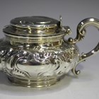 A William IV silver squat circular mustard, decorated in relief with floral and foliate decoration, London 1832 by Edward, Edward jnr, John & William Barnard, height 6cm, and a silver cylindrical mustard, decorated in relief with foliate scrolls, flanked by a foliate scroll handle, London 1839 by Joseph & Albert Savory, height 8cm, together with two silver Fiddle pattern mustard spoons, London 1830 and 1840, total weight 353.9g.
