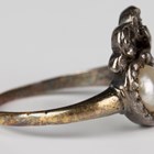 A Victorian gold and silver set, garnet, half-pearl and diamond ring, designed as two interlocking hearts, one set with an oval cut garnet, the other with a half-pearl within a surround of rose cut diamonds, below a diamond set surmount, inscribed within the shank 'In Memoriam... ab.25th Jan 1864', unmarked, weight 3.3g, ring size approx K, with a case.