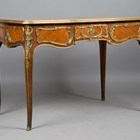 A fine late 19th century Louis XV style kingwood and ormolu mounted bureau plat, the parquetry top above three frieze drawers, raised on cabriole legs, height 77cm, width 109cm, depth 65cm.