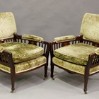 A pair of Edwardian mahogany salon armchairs with boxwood inlaid decoration, height 78cm, width 71cm, depth 61cm.