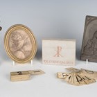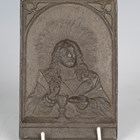 A small group of collectors' items, including a cast bronze abstract figure, detailed 'Vitali A15 1977', height 18cm, a group of 19th century bone alphabet tiles and a cast iron devotional plaque.