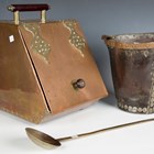 A 19th century leather and brass mounted fire bucket, height 25cm, a set of Salter's Trade spring balance scales, a copper coal box, a brass ladle and two cast iron heads.