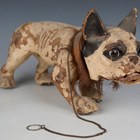 A late 19th century papier-mâché barking model of a French bulldog with typical articulated jaw, length 47cm (faults and wear).