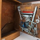 A Bryans Elevenses oak cased penny slot machine with chromium plated mounts and polychrome striped celluloid back panel, 63cm x 44cm.