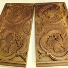 An early 20th century ecclesiastical carved oak panel, modelled in relief with four emblems of the gospel, the reverse bearing paper label inscribed 'Designed & Carved by H. Lilian Orlson... ', 61cm x 61cm.