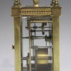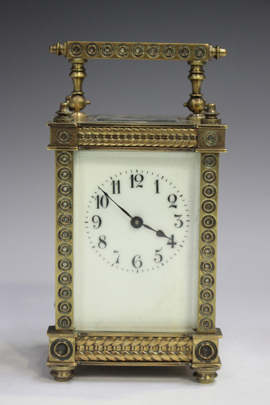 A late 19th/early 20 century lacquered brass carriage timepiece with eight day movement, the dial with Arabic hour numerals, the glazed case with roundel bands to swing handle and upright borders and laurel bands to horizontal borders, on turned feet, height 15.2cm, together with a late 19th/early 20th century brass corniche cased carriage clock with eight day movement striking hours and half hours on a gong, the white enamel dial with Roman hours and outer Arabic minutes, the glazed case with swing handle and bracket feet, height 17.5cm.