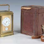 A mid to late 19th century lacquered brass grande sonnerie carriage alarm clock with eight day movement, striking and repeating on two gongs, the circular enamel dial with black Roman hour numerals and outer Arabic minutes above subsidiary alarm dial with Arabic numerals, within a matt gilt surround, the gorge case with bevelled glass panels and swing handle, the oval escapement glass with engraved monogram, the underside with three position setting lever for 'Gde Sonnerie', 'Silence' and 'Hres et Quarts', height including handle 18.4cm, together with original replaced platform escapement and leather travelling case, initialled 'E.R.'. Note: the E.R. initial to outer case is purportedly that of a member of the Rothschild family; the current vendor's grandfather worked as an agent for the Rothschilds and it is believed that this carriage clock was given as a gift.
