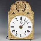 A late 19th century French comtoise or morbier wall alarm clock, the eight day movement striking on a bell, the circular enamel dial with Roman hour numerals and subsidiary alarm dial, the embossed brass surround decorated with anthemion and scrolls, height 42cm, with folding pendulum and two weights.
