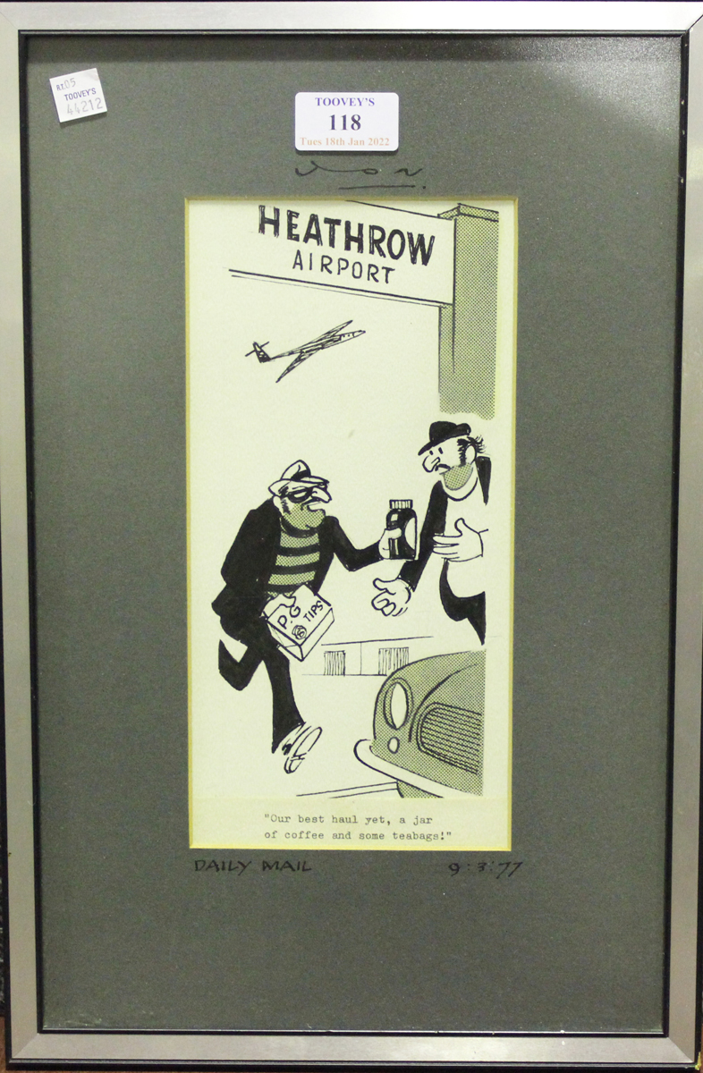 Jon [William John Philpin Jones] - 'Our best haul yet, a jar of coffee and some teabags!', 20th century pen and ink cartoon for the Daily Mail, titled, signed and dated '77 to mount, 24.5cm x 12cm, within an ebonized and silvered wood frame.