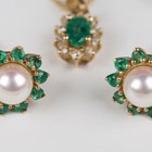 A 9ct gold, emerald and diamond oval cluster pendant, weight 0.7g, length 1.6cm, on a gold neckchain, detailed '10K', weight 1g, length 43cm, a pair of 9ct gold, emerald and diamond drop shaped pendant earrings, a pair of 9ct gold, emerald and cultured pearl cluster earstuds, total weight of two pairs of earrings 2.9g, and a pair of emerald and colourless gem set oval cluster earstuds, unmarked, with a case.