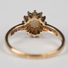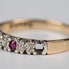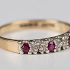 A 9ct gold ring in a buckle and strap design, London 1989, ring size approx P1/2, a 9ct gold, opal and cubic zirconia oval cluster ring and a 9ct gold, ruby and diamond half-hoop ring (one ruby lacking), total weight 8.1g.
