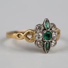 An emerald and diamond ring, mounted with a row of three emeralds between two rows of three circular cut diamonds, unmarked, ring size approx M, with a case.