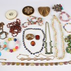 An Egyptian Revival blue faience and coral cylinder bead fringe necklace, length 38cm, a rock crystal graduated faceted bead necklace, length 78cm, a tiger's eye bead necklace and a group of costume jewellery, including bangles, bead necklaces and three powder compacts.