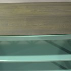 A modern turquoise enamelled steel open dwarf bookcase by 'Steel Vintage', the top inset with stained ash, height 75cm, width 200cm, depth 40cm.