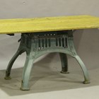 A late 19th century turquoise painted cast iron industrial machinery stand, made for Henry Bamford & Sons of Uttoxeter, repurposed to form the base of an oak-topped table, height 71cm, width 180cm, depth 110cm.