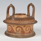 An ancient Greek earthenware pyxis type vessel, or lamp base, the twin-handled body with painted scrolling band, height 9.5cm, diameter 10cm.