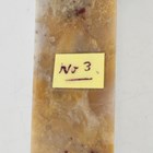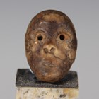 A pre-Columbian Mayan style carved dark green hardstone mask, probably 600-800 AD, height 5cm, together with a Mayan miniature head bead, height 2.2cm, later mounted on a hardstone pedestal, both items bearing collectors' labels. Provenance: from the estate of a West Sussex collector.