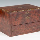 A Victorian amboyna writing box, inlaid in brass and mother-of-pearl, the compartmentalized interior above a pull-out writing slope, width 28.5cm.