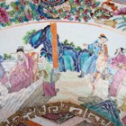 A Chinese Canton famille rose porcelain circular basin, mid-19th century, the interior painted with figural scenes within a rim of precious objects, butterflies and flowers, diameter 41cm, height 12.7cm.