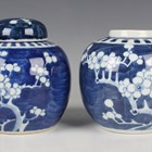A Chinese blue and white porcelain baluster vase and cover, mark of Kangxi but late 19th/early 20th century, painted with prunus, underglaze blue four-character mark to base, height 27.5cm, together with a similar Chinese blue and white painted vase with figures and buildings in landscape, height 22.5cm (hairline crack to rim), a smaller blue and white vase, height 9.2cm (chip to rim), and three blue and white ginger jars (some faults).