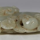 A Chinese pale celadon jade carving, 20th century, carved and pierced with a boy clasping a lotus branch, seated upon a taotie mask with lingzhi fungus, length 5cm.