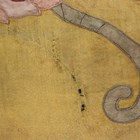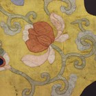 A Tibetan yellow silk ground embossed panel, 19th century, applied with a dark blue Sanskrit character resting upon a lotus pod issuing scrolling tendrils with leaves and flowers, mounted on a black silk ground, 52.5cm x 85.5cm. Provenance: from the estate of a West Sussex collector.