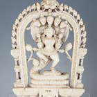 An Indian carved ivory dancing Shiva hair comb, 17th century, finely carved and pierced with the god dancing on a five-headed cobra forming a canopy, all framed by an arched flame mandala, length 15.4cm. Provenance: from the estate of a West Sussex collector.