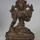 A Tibetan brown patinated bronze figure of Tara, late 19th century, modelled seated in dhyanasana on a double lotus throne, height 11.3cm, together with another bronze figure of a seated bodhisattva, height 18.5cm. Provenance: from the estate of a West Sussex collector.