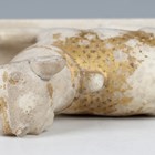 Two Indian carved alabaster figures of a Nandi bull and lion, 19th century, each with gilt decoration, length 15cm and 16.5cm (chips to ears and horns of Nandi bull and wear to gilt of both). Provenance: from the estate of a West Sussex collector.