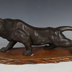 A Japanese brown patinated bronze model of a tiger, Meiji period, modelled standing with patinated stripes, cast signature seal to underside, length 44cm, together with a carved wood stand.