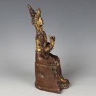 A Tibetan brown patinated and parcel gilt bronze figure of a bodhisattva, probably 17th, modelled seated wearing an elaborate headdress, jewellery and celestial scarf, height 17.9cm (fracture to neck and other faults).