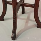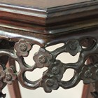A Chinese hardwood stand, 20th century, the octagonal top inset with a rouge marble panel above a carved and pierced prunus apron, on four cabriole legs united by an 'X' stretcher, height 92cm.