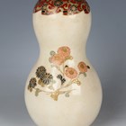 A Japanese Satsuma earthenware vase, Meiji period, of gourd form, enamelled in gosu blue, green, iron red and gilt with opposing sprays of flowers beneath a simulated brocade rim, unsigned, height 14.5cm.