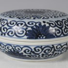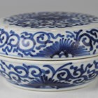 Two Chinese blue and white cargo export porcelain circular boxes and covers, Kangxi period, each painted with flowers and scrolling tendrils, diameters 10.5cm.