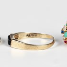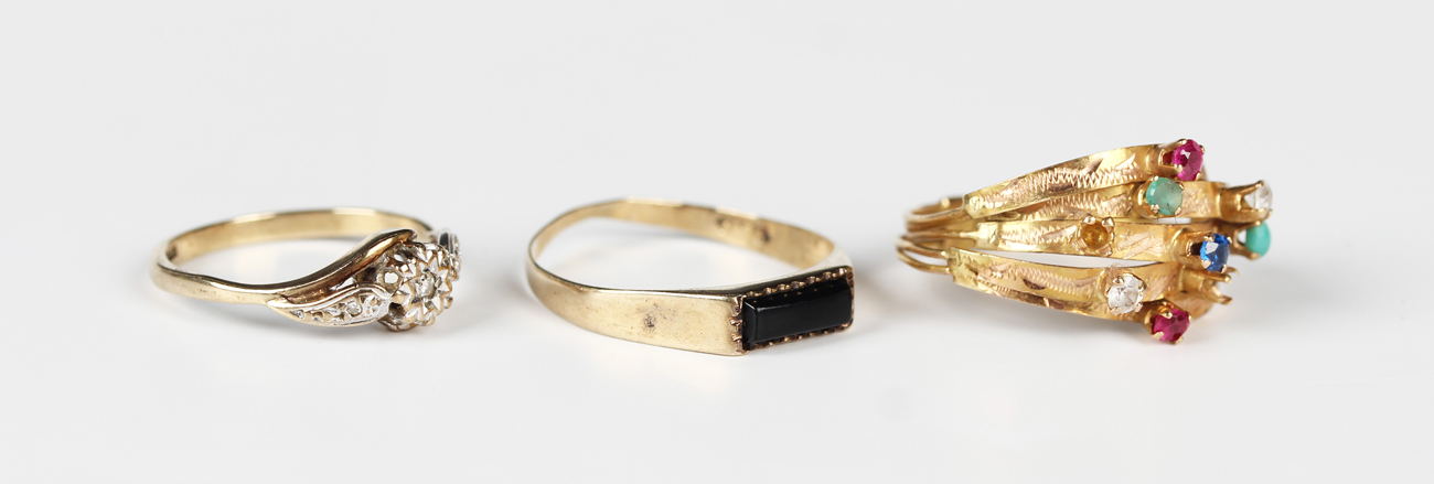 A Middle Eastern gold and varicoloured gem set five shank ring, weight 2.1g, (two gems lacking), a 9ct gold and diamond ring in a twistover design and a 9ct gold and rectangular black onyx ring, weight 2.8g.