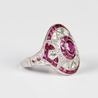 A platinum, ruby and diamond cocktail style ring, collet set with an oval cut ruby within a surround of calibre cut rubies, otherwise in a pierced design, set with variously cut diamonds and an outer border of calibre cut rubies, unmarked, weight 5.4g, total ruby weight approx 1.15ct, total diamond weight approx 0.77ct, ring size approx M1/2.