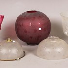 A Victorian frosted pink glass globular lamp shade with overall cut stars, diameter 31cm, together with two similar domed shades, a cranberry glass shade with gilt metal 'Veritas' fittings and another frosted glass shade.
