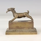 A 19th century gilt bronze ink stand, the removable lid in the form of a running dog holding a letter, the underside bearing label detailed with purported provenance, width 9.2cm.