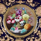 A Ridgway porcelain cabinet plate, circa 1845-50, pattern No. 6/2767, painted with a central still life study of a flower basket on a marble ledge beside a pineapple, the cobalt blue rim reserved with salmon pink foliate scrollwork and trellis panels, edged in gilding, diameter 23.5cm (fine starcrack), together with a Ridgway Bates & Company cabinet plate, circa 1856-58, painted with a boy tying a girl's shoe within a gilt overlaid cream border, unmarked, diameter 23.3cm. Note: a similar plate is illustrated by Geoffrey Godden in 'The Illustrated Guide to Ridgway Porcelains', pl. 139.